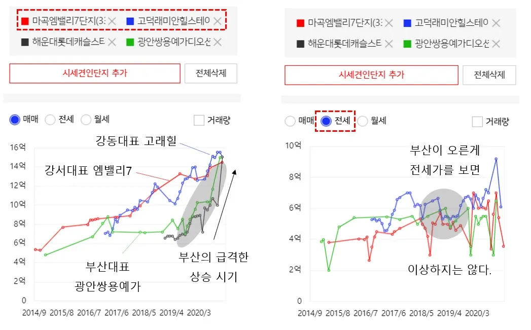 이때 가격 흐름 비교는 매매 뿐만 아니라 전세 가격의 흐름도 함께 체크해 보시는 것이 좋습니다.