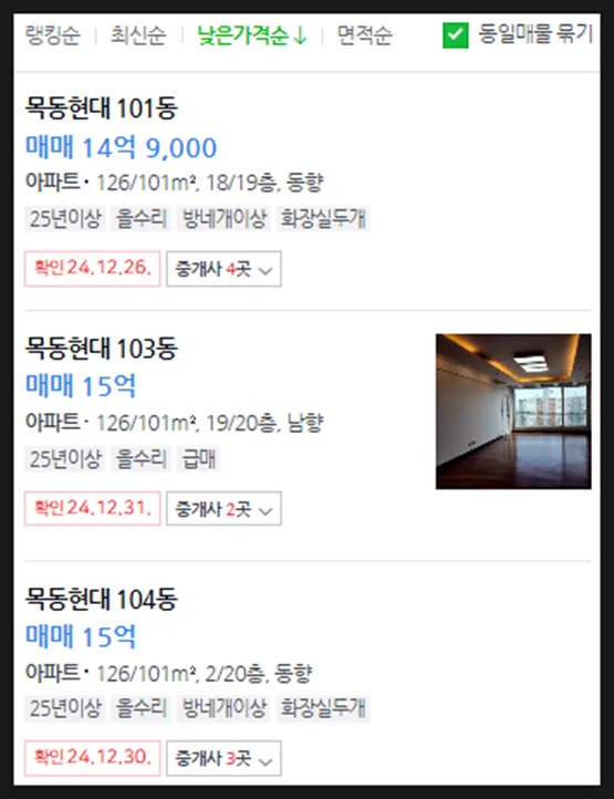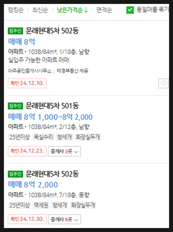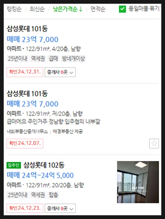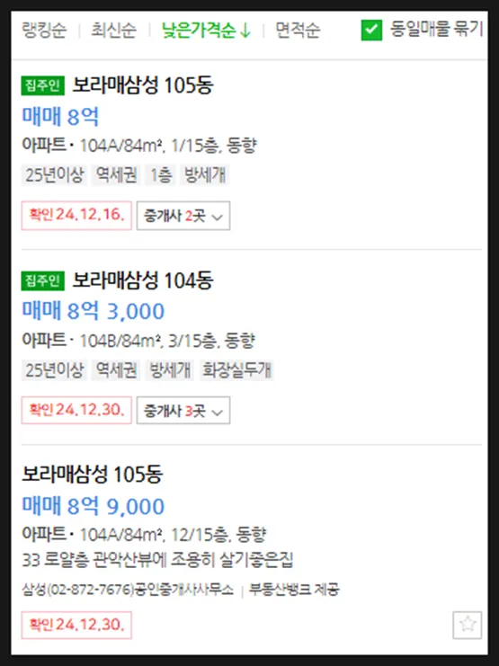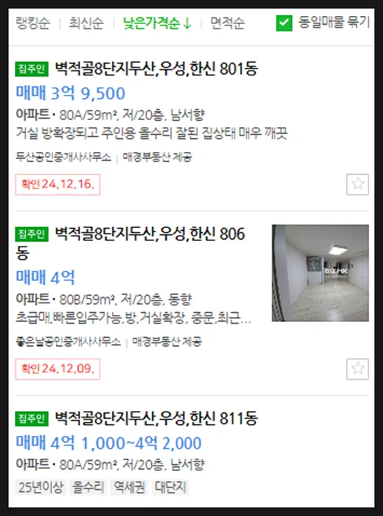 최근 거래가 감안시 최저가매물들은 거래되었을 확률이 높음, 임장 및 부동산을 통해 실제 매물여부 파악할 것