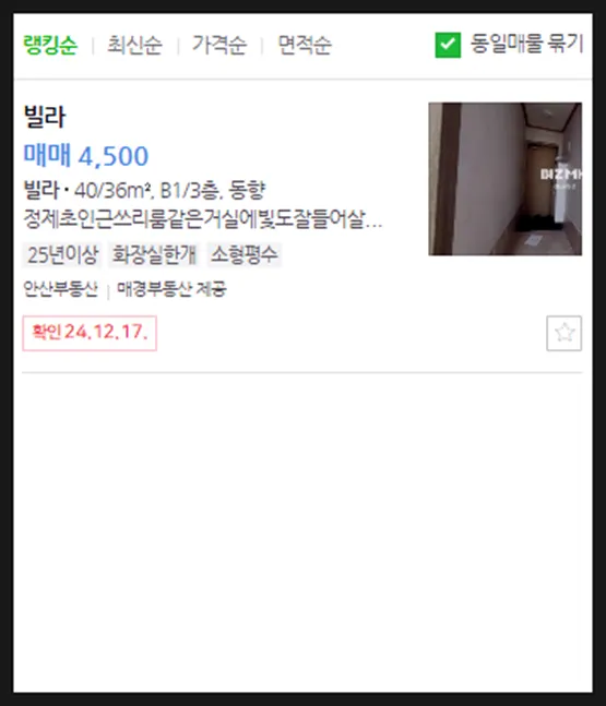 해당매물 없으며, 주변 매물가 감안한 추정가격 5000만원 이상