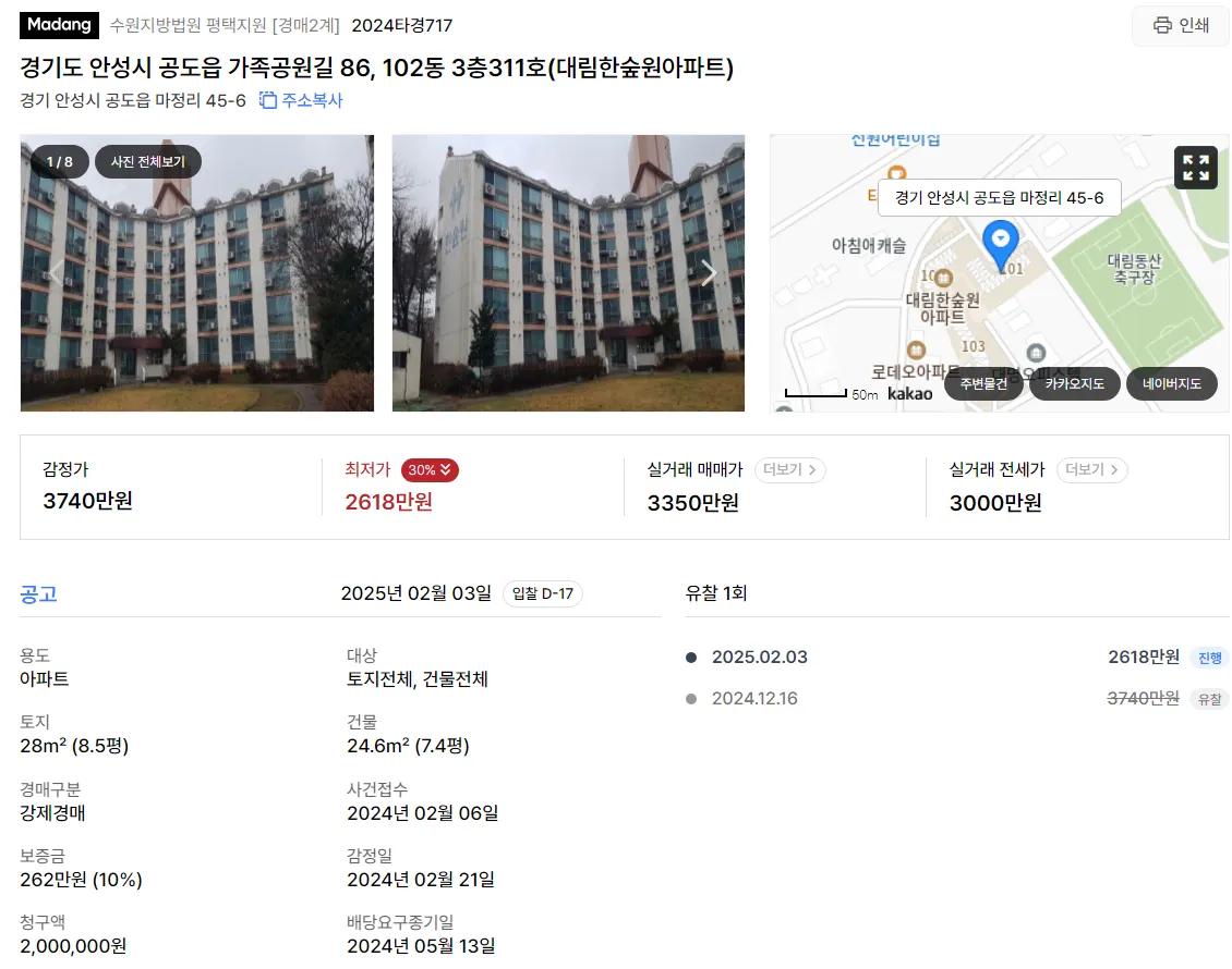 2회 유찰로 전세가보다 낮은 최저매각가로 가격 메리트 높음