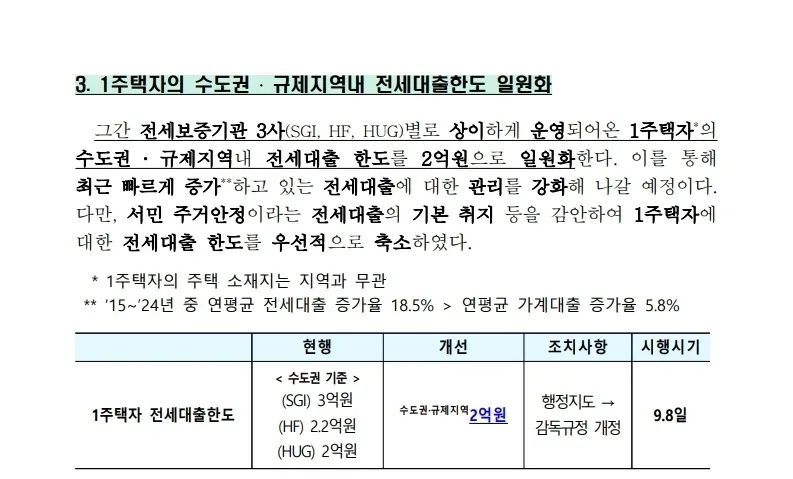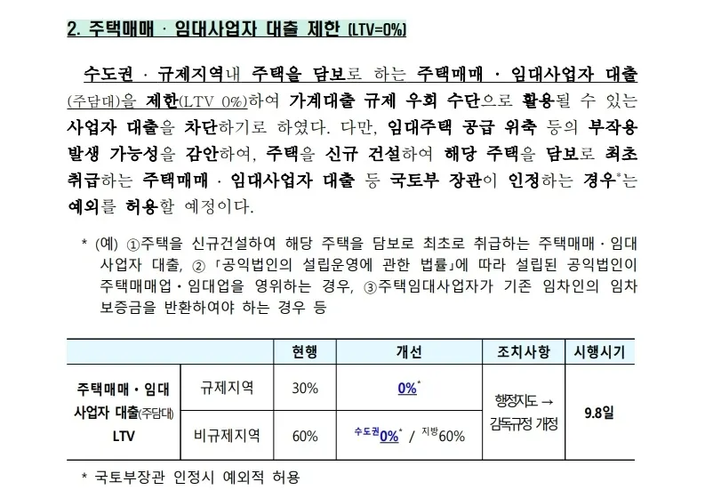 9.7 대책은 이러한 기조를 더욱 강화했습니다. 다주택자와 임대사업자의 자금줄이 차단되었고, 1주택자의 전세대출 한도도 축소되었습니다. 규제 지역의 주택담보대출 LTV는 50%에서 40%로 낮아졌고, 수도권의 매매 및 임대사업자 대출은 사실상 불가능해졌습니다. 또한 1주택자의 전세대출 한도는 보증기관과 관계없이 2억 원으로 통일되었고, 이전보다 1억 원 줄어든 한도는 실수요자의 부담을 키웠습니다.