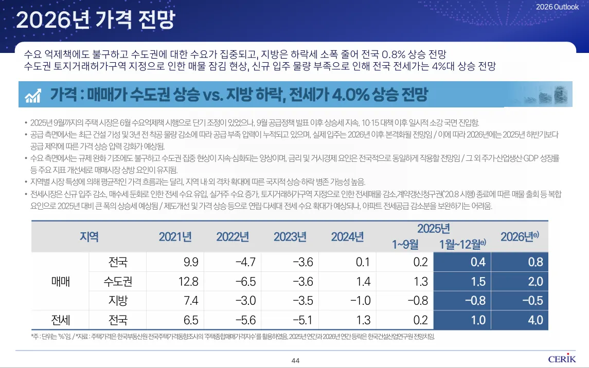본 글은 하나금융연구소 「2026년 부동산시장 전망」, 국토연구원 부동산시장정책연구센터 「2026년 주택부동산 경기 전망 보고서」를 참고하였습니다.