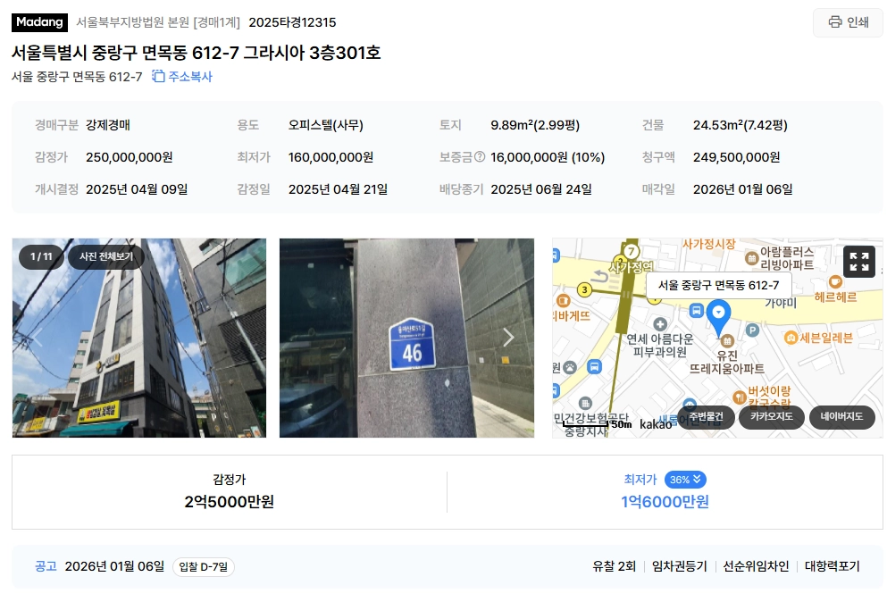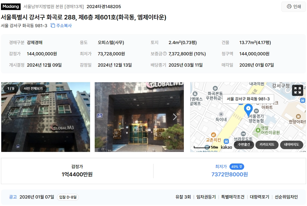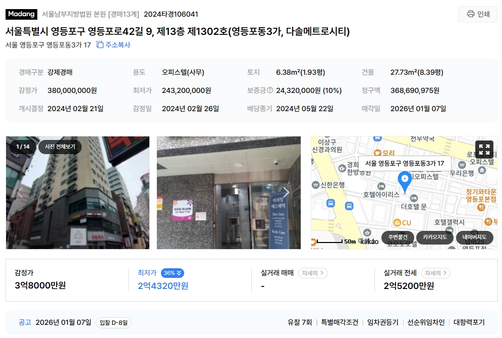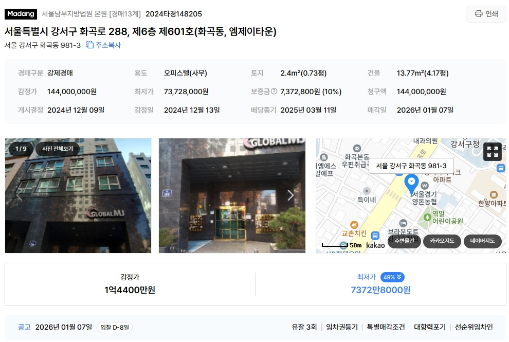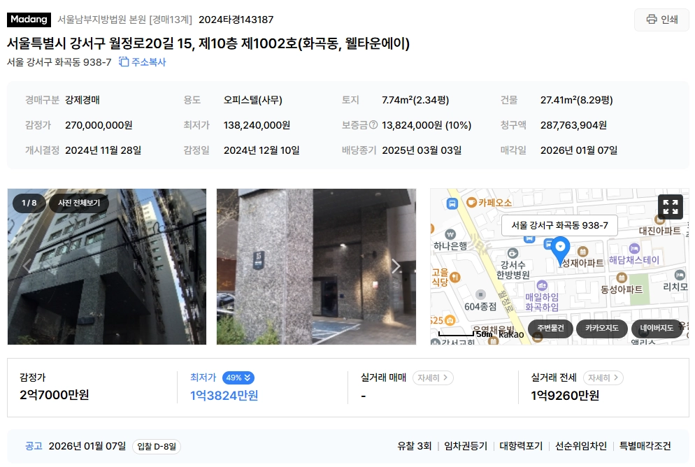 현재 이 건물 오피스텔 대부분이 경매 진행되었고, 낙찰은 2억 3000만원대 낙찰되는 중