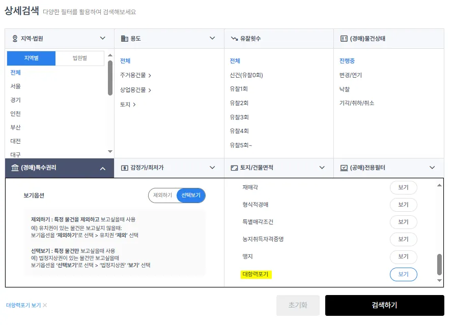 검색필터 > 특수권리(선택보기) > ‘대항력포기’ 보기로 설정 후 검색!